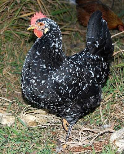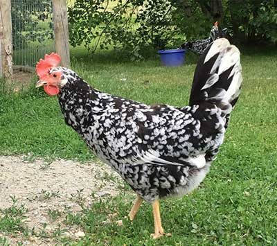 | Feather Type | Mottled black with white spots |